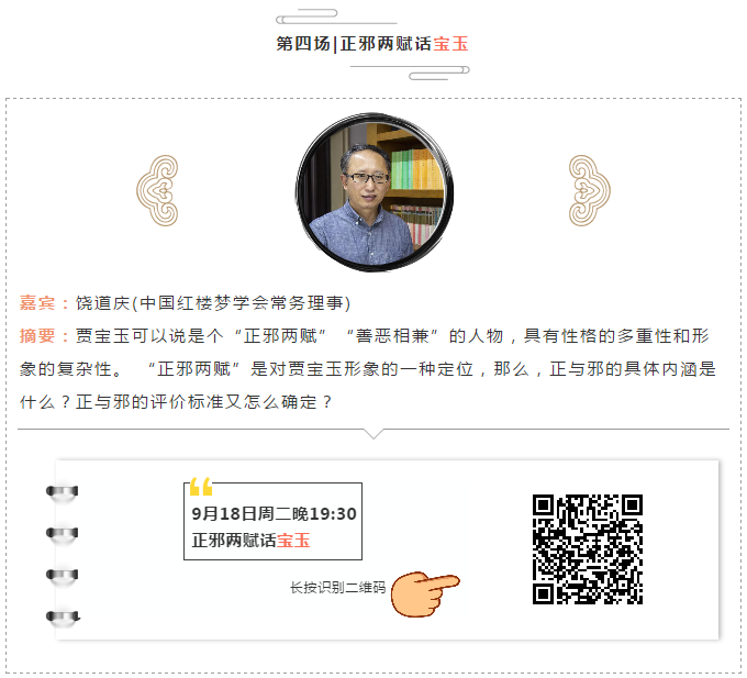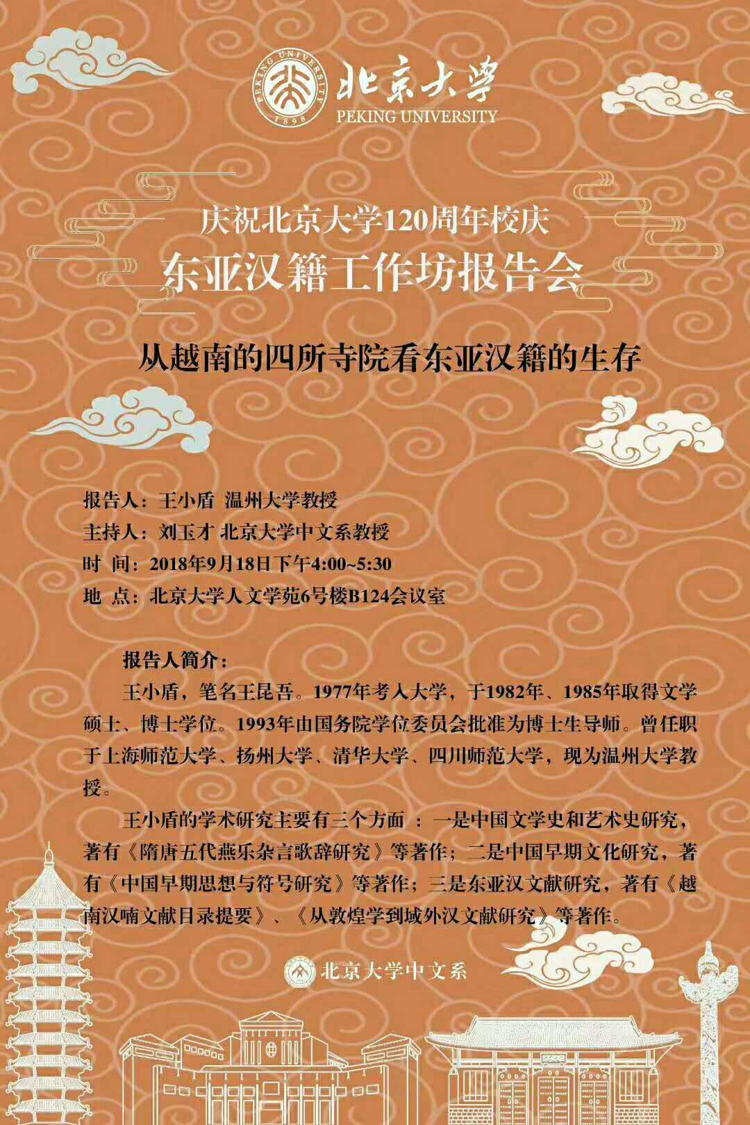 9月18日,对于中国人来说,今天是一个特殊的日子:勿忘国耻,铭记历史。对于2138cn太阳集团古天乐来说,今天也是一个值得书写的历史。今天上午9:30-12:00,2138cn太阳集团古天乐特聘教授王小盾在中国社会科学院文学所第一会议室主讲古代文学学术论坛第6期 《<汉书艺文志>中的文学问题》。今天下午4:00~5:30王小盾教授将在北京大学人文学苑6号楼B124会议室作题为《从越南的四所寺院看东亚汉籍的生存》的主题报告。今晚19:30开始,中国红楼梦学会常务理事饶道庆教授将在北京的恭王府开讲《“正邪两赋”话宝玉》,这是北京青年报"青睐"线下活动携手恭王府举办"走进红楼梦中人——恭王府与《红楼梦》“主题系列讲座的第四场。