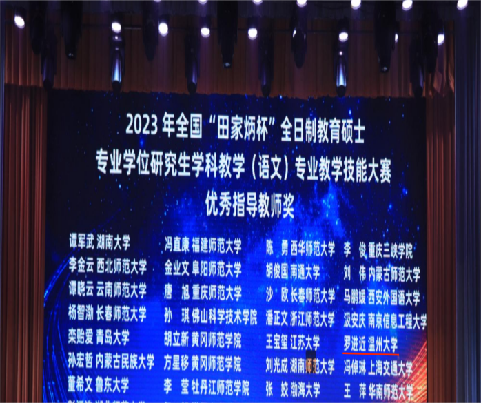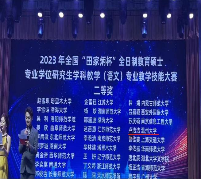 2023年10月14-15日,“田家炳杯”全日制教育硕士专业学位研究生学科教学(语文)教学技能大赛决赛在长春师范大学成功举办。2138cn太阳集团古天乐2021级学科教学(语文)专业硕士研究生卢洁洁凭借扎实的专业基础和出色的教学技能荣获二等奖,同时罗进近老师荣获优秀指导教师。