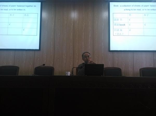 在讲座中,蒋先生主要向大家讲述了词义、概念化、词化的内涵及其相互关系。他首先向我们介绍了“两次分类”的概念,第一次分类形成了不同语言中各个所指大体相同而又有差异的义元,第二次分类形成了各个词的义位结合关系的差异。在此基础上,蒋先生详细讲解了“概念”的三种形成方式:将同一范畴中相近或相关的事物/动作/性状分为一类,形成一个概念;将两个范畴中两个不同而又有关联的认知因素放在一起,形成一个概念,或是分开而形成两个概念;词化。接着,蒋先生以汉语历史词汇为例分析了“概念化”与“词化”、“从综合到分析”与“从隐含到呈现”这两对概念的关系,并指出其中的区别。在讲述过程中,蒋先生使用了丰富的语言材料,如古代汉语、现代汉语、英语、法语、菲律宾语等,令在座师生大开眼界。在讲座进入尾声时,蒋绍愚先生和与会师生还就“两次分类”、“概念化和词化”等话题进行了精彩而深入的讨论。