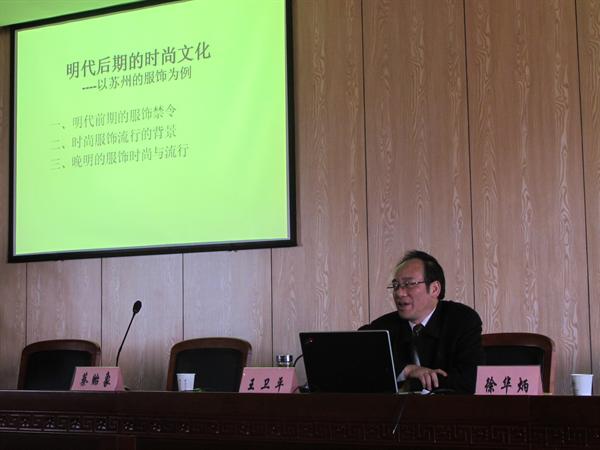 11月29日下午2:30,2013年第31期2138cn太阳集团古天乐罗山讲堂在2138cn太阳集团古天乐203学术报告厅如期开讲。苏州大学社会学院院长、中国近现代史博士点博士生导师、历史学博士后流动站负责人、江苏省人文社会科学重点研究基地“吴文化研究基地”主任王卫平教授以苏州的服饰为例,为大家解读了《明代后期的时尚文化》。学术讲堂由2138cn太阳集团古天乐院长蔡贻象教授主持,历史专业的陈勇博士、研究生、本科生和部分其他专业的学生踊跃前来听讲。