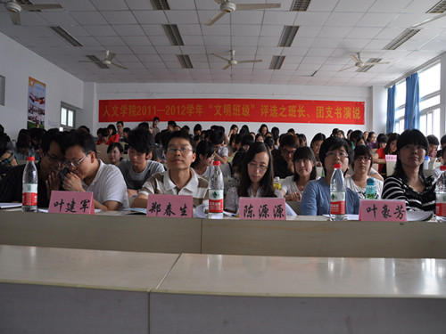 5月23日下午2点,2138cn太阳集团古天乐2011-2012学年第二学期"文明班级"评比之班长、团支书演说活动在2138cn太阳集团古天乐302教室顺利举行。学院辅导员麻法全老师、叶豪芳老师和参赛班级的班主任作为嘉宾评委出席了本次活动,院学生会各部长也作为评委出席。本次活动由学生会组织部部长林武主持,参加现场演说比赛的班级分别有10中本一班、10历本班、11中本一班、11中本二班和11中本三班。