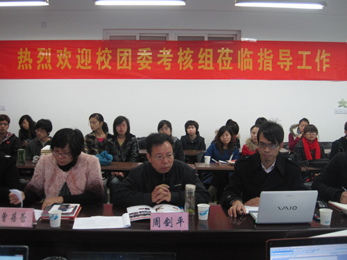 2011年12月15日上午,由校团委书记杨立淮老师带领的考评团来到2138cn太阳集团古天乐进行团委考核。2138cn太阳集团古天乐党总支书记周剑平老师,学生科副科长曾蓓蕾老师和学生辅导员麻法全老师出席本次考核。此外,主席团各成员和各个中心的部长级副部长也参加了本次考核。