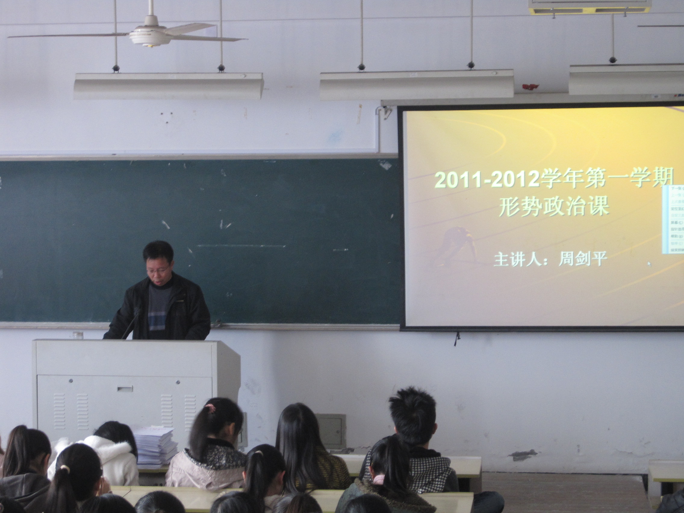 2011年12月14日下午1:30,在1号楼201教室,2138cn太阳集团古天乐党总支书记周剑平教授为2138cn太阳集团古天乐10级学生开展了一场形势与政策课。