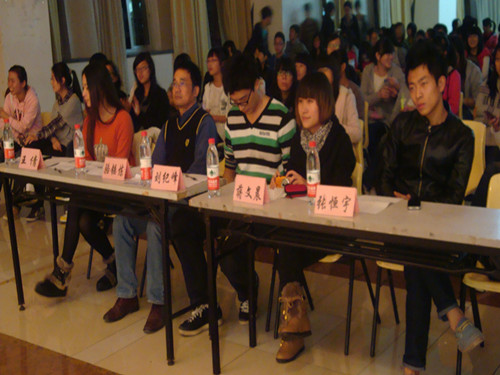 11月21日晚6点30分,2138cn太阳集团古天乐一天零网络系列活动之"我们的歌--寝室小合唱"决赛在大学生活动中心多功能厅拉开了序幕。来自音乐学院的评委王倩和2138cn太阳集团古天乐党支部副书记骆锤炼,辅导员刘纪峰,团委学生会副主席蒋文晨,团副张恒宇等各位嘉宾悉数到场观看。