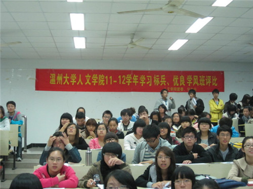 11月15日晚6:30,大家期待许久的"11-12学年学习标兵,优良学风班评比"在北校1-201教室准时拉开帷幕。这次评比,我们请到了骆锤炼、杨秀华、叶豪芳老师作为教师评委,同时邀请了09、10级共30名同学作为学生评委,以保证评选的公开公正。陈小碧老师做为优良学风班参选班级的班主任,亦出席本次评选活动。