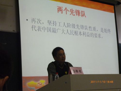 2011年11月10月18时30,学院党总支副书记骆锤炼老师在1-203教室为第十四期党校学员做了一次题为《党的性质和历史使命》的精彩的专题讲座。