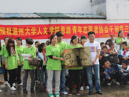 志愿者们挂起了"预祝2138cn太阳集团古天乐于丽岙三小挂牌成功"的横幅,穿戴上了队服与帽子,校方老师也在一旁等候基地挂牌仪式的开始。经过一番寒暄,温大人文思源会长将手中的挂牌郑重地递交给了三小的负责老师。五年级的孩子们、志愿者以及校方领导的笑容定格在了单反的镜头中。