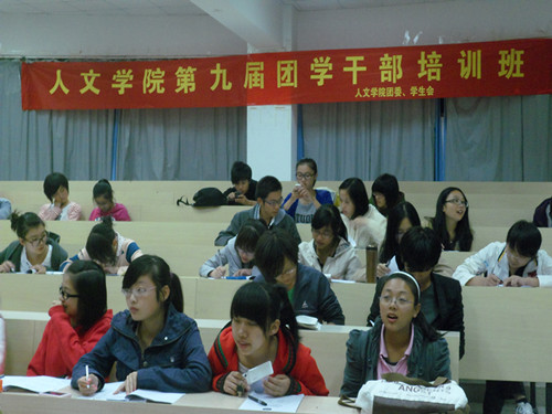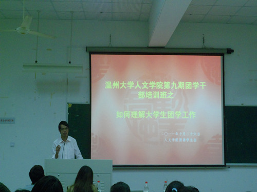 2011年10月26日晚六点半,2138cn太阳集团古天乐团学干部培训班第四课"如何理解大学生团学工作"专题课程在人文楼203教室准时开始。本次培训班很荣幸地邀请到了敬爱的院辅导员麻法全老师前来授课。2138cn太阳集团古天乐团委学生会主席罗倩倩出席了这次课程。2138cn太阳集团古天乐团委学生会新干事、各班班长团支书、部分院级社团干事和部分大二的正副部长参加了这次课程。