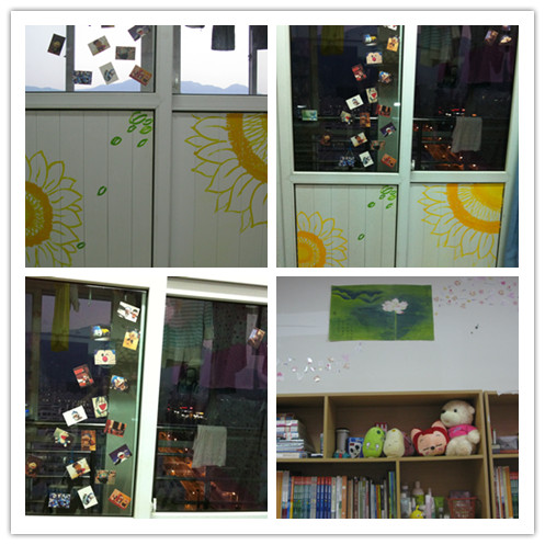 接下来,我们来到了13楼,这里大多是新生的寝室,更是创意迭出,各具风格。每个寝室的同学都热情地为评委讲解她们别出心裁的创意,有的寝室还播放起轻柔的背景音乐。最令人印象深刻的是1313寝室,我们刚进门,一抬头便惊喜地发现满天星辰,五颜六色的在头顶闪耀,竟然在走廊里平白地造了一整个的星空!瞬时恍如走入童话的世界。视线下移,走廊的门帘上七彩字上下跳跃:1313亮晶晶,勾起了大家对儿歌的回忆:一闪一闪亮晶晶,满天都是小星星......还有1312的小朋友们,很用心地在地上用紫色花瓣铺了一个大大的爱心,一下子吸引了大家的眼球。