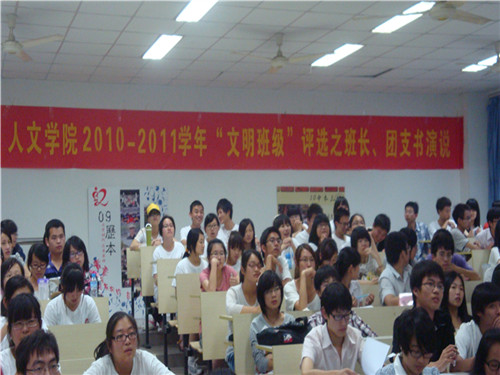 5月26日晚6点20分,在2138cn太阳集团古天乐人文楼举行了2138cn太阳集团古天乐2010-2011"文明班级"评选之班长团支书演说。2138cn太阳集团古天乐党总支副书记骆锤炼老师、教学科杨东永老师、辅导员麻法全老师作为本次演说的评委参与了活动,而10中本1班的班主任陈源源老师和10中本2班的班主任陈伟娜老师则作为本次演说的嘉宾来到了现场。