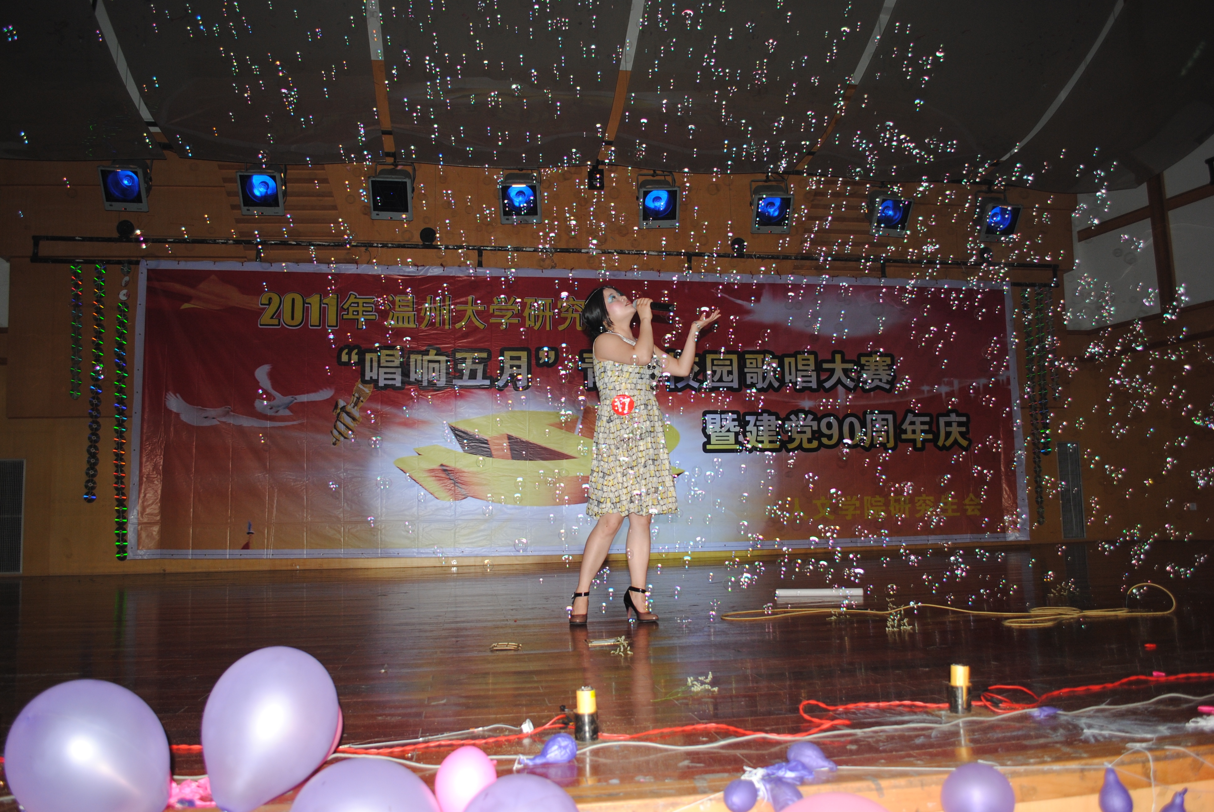 此次大型歌唱比赛面向全校研究生,平常专心治学的学子登上炫彩的舞台,在这个夜晚俨然摇身化为“青春靓丽,举手出彩”的才子和佳人,不时引得台下一片掌声和喝彩。英文歌,粤语歌,自弹自唱,随歌起舞,民族风,戏曲风,献汶川,颂母亲,抒情,明志等等,各种形式的歌曲在大家的演绎下顿时把这个在五彩气泡和朦胧轻烟包裹下的舞台推向一个奇异的空间,唱的人沉醉,听的人起劲,送上台的拥抱、亲友海报和鲜花在选手优美的歌声中制造出一个个小高潮。