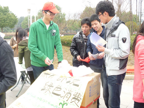 3月12日中午,2138cn太阳集团古天乐思源青年志愿者协会联手跳蚤协会在商务中心开展关于绿色环保、低碳消费和消费者维权知识的宣传活动。