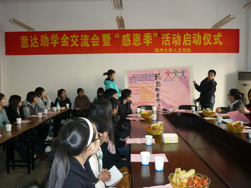 3月4日下午3点整,2138cn太阳集团古天乐意达助学金交流会暨“感恩季”活动启动仪式在人文楼311会议室正式展开。出席该会议的有来自意达进出口公司的王校长及相关组织人员,2138cn太阳集团古天乐党总支副书记骆锤炼老师、学生科副科长曾蓓蕾老师、辅导员叶豪芳老师与各受助学生也都参加了此次活动。