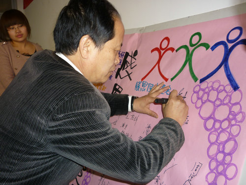 活动伊始,曾老师组织参加人员在人文楼外的草坪种下了“感恩树”。王校长、骆老师和受助学生们一起种下象征顽强和生机的松树,这也表达了受助学生们感恩之心。其后,一行人回到会议室交流助学情况。交流会上,骆老师首先代表学院向意达来访人员表示了热烈的欢迎和感谢并简述了受助学生的基本情况。紧接着,王校长发表讲话,教导在场学生要不怕困难、好好学习、好好生活、学会感恩、回报社会。之后,受助学生们分别讲述了自己在上学期的学习和生活情况,谈了自己在春节的经历并诉说了自己对未来的期望。“小事情里见真情”,这是王校长总结学生发言后的感受。他不仅告诫学生们勤工俭学不能影响学业、学生要以学习为首要目的,而且期望学生们要有更高的道德素养,尊敬师长、帮助他人、做个全面发展的人。随后,在曾老师的主持下,受助学生作为首批感恩使者宣读了感恩宣言,学生代表还向王校长献上鲜花表示敬意。在骆老师和王校长的带领下,全体参加人员都在宣言板上签名,留下了美好回忆。最后,王校长代表意达集团授予学生奖学金。