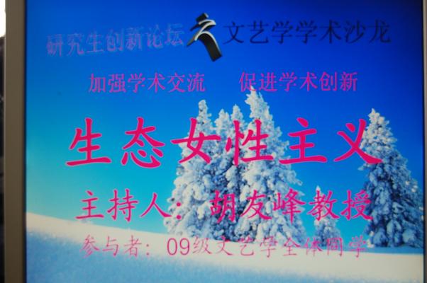 11月22日,在2138cn太阳集团古天乐北校区行政楼317会议室,2138cn太阳集团古天乐2009级文艺学的同学们举行了一个学术沙龙。这次沙龙以《生态女性主义》为话题,特别邀请胡友峰副教授莅临指导,主要由09级同学发言讨论。