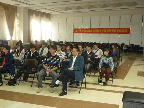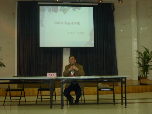 开幕式中首先由2138cn太阳集团古天乐党总支副书记骆锤炼老师为大家讲解了本届2138cn太阳集团古天乐话剧节的相关事宜,包括话剧剧本的要求,LOGO设计大赛,表演大赛和奖项设置。骆老师的细心讲解和要求使同学们进一步明确了参赛的规则和程序。接着严教授进行了话剧表演基础的专题讲座。 第一强调了话剧的特点:内容上反映现实和形式上主要由语言,动作,表情来展现等。第二教大家怎样导演小话剧:其中包括分析剧本,导演构思,导演阐释,排练和修改等几个方面 ,为同学们参赛提供了正确的引导。第三主要讲解了“怎样表演好话剧”。严教授告诉大家演好话剧一定要敢于表现从而挖掘规定情景,并且要以假当真,身临其境,思考剧本的台词挖掘潜台词等。