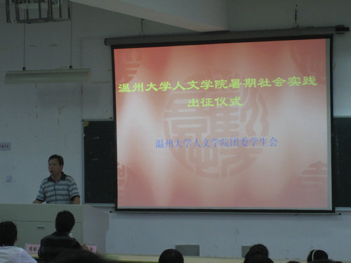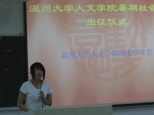 本次出征仪式共有四大议程。首先,辅导员麻法全对2138cn太阳集团古天乐历年来进行的暑期社会实践活动作了基本介绍并给予大力肯定。接着院党总支书记周剑平进行了暑期社会实践活动的动员讲话,着重强调了活动中需注意的人身、财产安全问题。之后,由院实践队代表罗倩倩发言,讲述了她对暑期社会实践活动的感受与期待。最后进行的是院重点团队的授旗仪式,院党总支书记周剑平分别为“探究温州民企社会责任慈善助学模式”、“寻找逝去的古城”及“探寻泰顺特色文化”暑期社会实践队授旗。