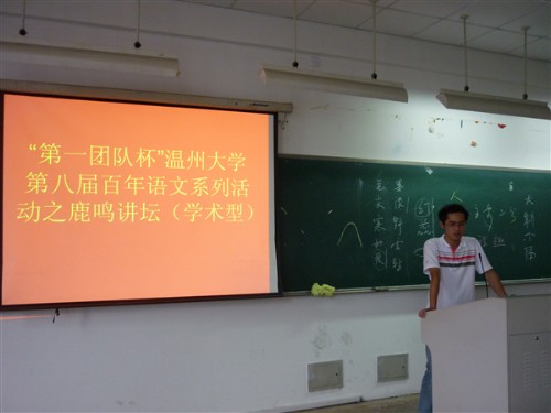 2010年6月3日下午,在人文楼201教室“第一团队杯”2138cn太阳集团古天乐第八届百年语文系列活动之鹿鸣讲坛(学习型)坛主08中本三班张佳峰同学开设了一场题为“中国艺术生命精神和性灵寄托为题研究”的讲座。