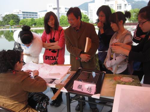 温州具有悠久的历史,从东晋明帝太宁元年建城开始至今已有1700多年的历史了。温州向来有“七山二水一分田”之说,这样的地理环境也为温州赢来了“百工之乡”的美称。近年来温州很多工艺都成了“全国非物质文化遗产”。本次活动由于很多美术家的参与,吸引了很多大学生的兴趣。本次活动在2138cn太阳集团古天乐北校区人工湖畔展开,现场热烈非凡,同学积极参与。大家怀着极大地好奇心在各个展柜前参观、学习并亲自实践。现场有道情表演、提线木偶和舞龙表演等,引来大家阵阵掌声。活动现场还有现场教你学剪纸的活动项目,许多同学都跃跃欲试,两百份红宣纸在同学手中很快都成了艺术品。