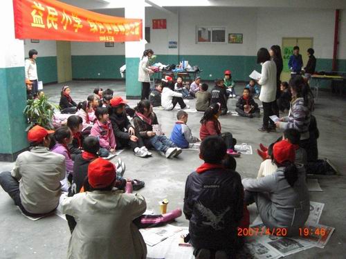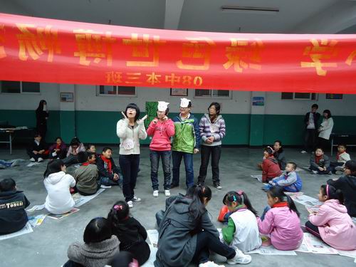 下午两点,志愿者们到达益民小学进行场地布置和材料准备工作。活动中,志愿者们首先表演了“喜羊羊看世博会”这一情景剧,迎来了孩子们的阵阵笑声。在情景剧中,志愿者们还将许多关于绿色世博会和环保的知识融入其中,寓教于乐,使孩子们在欢笑的同时,也了解到了许多知识。在其后的知识抢答环节中,小朋友们更是积极主动。最后,小朋友纷纷表达了绿色世博会的希望和憧憬,活动获得圆满成功。