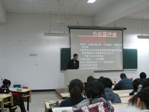 18:30,随着热烈的掌声响起,演说大赛正式开始。首先,2138cn太阳集团古天乐辅导员麻法全老师上台讲话。麻老师就业余团校理论和培训班的开设情况向同学们作了简单的介绍,对参与业余团校学习的同学提出了相关的要求,并预祝此次2138cn太阳集团古天乐业余团校活动顺利开展。接着,2138cn太阳集团古天乐08、09级的各班代表一一上台,以“一二·九”运动为主题,进行了精彩的ppt演说。他们的ppt制作精美,演说或是慷慨激昂、热情洋溢的,或是深沉冷静、发人深省的,他们以各自独特的形式与内容,讲述了这段红色历史,让大家回顾了这场伟大的大学生爱国运动,浓浓的爱国氛围深深地感染了在场的每一位同学,现场气氛活跃、热烈。最终,08历本荣获了本次比赛的一等奖,09中本三班和09广本获得二等奖,08中本三班、08中本一班、09历本获得三等奖,在热烈的掌声中,本次比赛圆满结束。