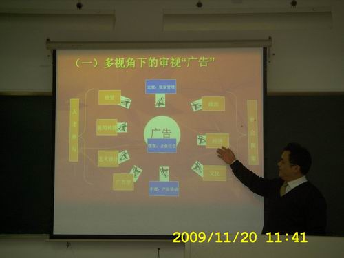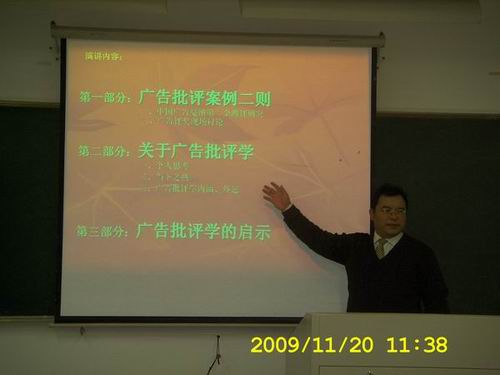 在同学们热烈的掌声中,刘宣如教授上台开始了讲座。有着丰富广告公司工作经验和各种广告大赛评比经验的刘教授,首先运用专业知识点评了2009年嘎纳广告节中获得金牌的广告作品,从而引发了我们对于广告批评的思考。随后,刘教授通过广告批评学域中的各大家之言与他自己在这块领域中的思考来展示现有的广告批评学,逐渐清晰了同学们对于广告批评学的理论思路。接着,刘教授还引用了各大广告公司董事长发表的关于广告的言论,引发了同学们的反思。最后,刘教授用一个批判官员腐败的平面广告例子生动讲解了关于广告批评学的思考。讲座过程中全场气氛活跃,李教授生动精彩的演讲,同学们积极踊跃的提问都为本次讲座涂上了浓墨重彩的一笔。