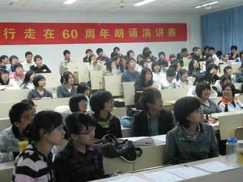 2009年11月12日晚,由2138cn太阳集团古天乐团委学生会学习部主办的“行走在60年”朗诵演讲决赛在1-202教室拉开了帷幕 。2138cn太阳集团古天乐党总支副书记魏成春老师、辅导员刘纪峰老师、学生会副主席卓艺颖同学应邀出席本次决赛并担任评委。