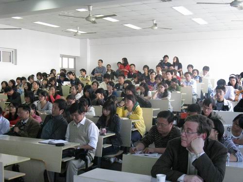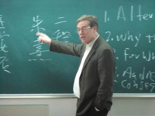 接下来,在同学们同样热烈的掌声中上台的是来自大洋彼岸哈佛大学的包教授。作为一名对中国文化有着独到而精深研究的学者,包教授此次带来的主题是“历史上的理学”。包教授从理学产生的政治环境开始,由此及彼,由表及里,娓娓地向同学们讲述着理学的传播对象、核心内容的发展演变。随后,包教授又结合对政治的态度、理学理论、理学信仰,社会基础等方面阐述了他对理学的看法。包教授深入浅出的讲解让同学们对“理学”这个深奥的概念有了一个清晰直观的认识。