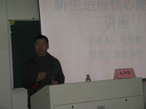 11日4日13:30,2138cn太阳集团古天乐新生适应性心理健康讲座在北校区人文楼203教室举行,担任主讲的是国家二级咨询师毛华配老师。