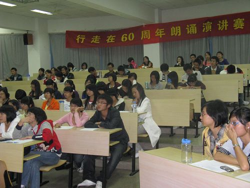 2009年11月5日,2138cn太阳集团古天乐以“行走在60周年”为主题的朗诵演讲赛在人文楼203教室举行。北校广播台前任播音部部长王玮、《温大青年》主编姚嘉雯、2138cn太阳集团古天乐学生会主席吴剑波担任本次比赛的评委。