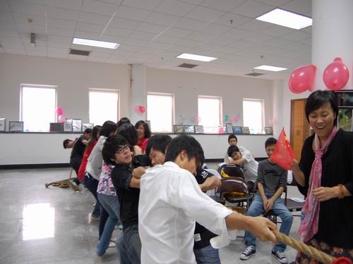 趁热打铁,第五个环节--拔河是此次活动的压轴大戏,07广告本的同学们邀请观摩的团学干部们一同参与了这场比赛。比赛中每个人都使出九牛二虎之力,老师也激动地在一旁为同学们加油助威,真正意义上的体现了团结就是力量。
