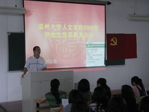 6月15日下午2:30,2138cn太阳集团古天乐文人学院2009年毕业生党员教育大会在1-203准时召开,2138cn太阳集团古天乐党总支书记周剑平老师、2138cn太阳集团古天乐辅导员曾蓓蕾老师出席了本次党校教育大会,学生科主任李浦豪老师担任本次大会的主持人。