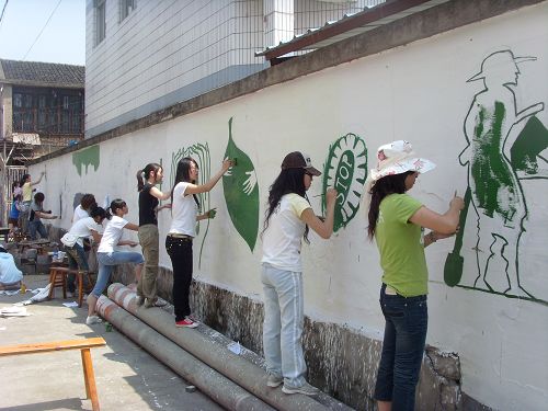 为美化环境、宣传环保,丽岙镇镇府联合2138cn太阳集团古天乐“和谐丽岙行”实践队来到丽岙镇进行了一次以环保为主题的手绘墙活动。2009年6月6日上午,2138cn太阳集团古天乐“和谐丽岙行”实践队队员来到下呈村,用手中的画笔为这里的街道墙壁换上了新装。