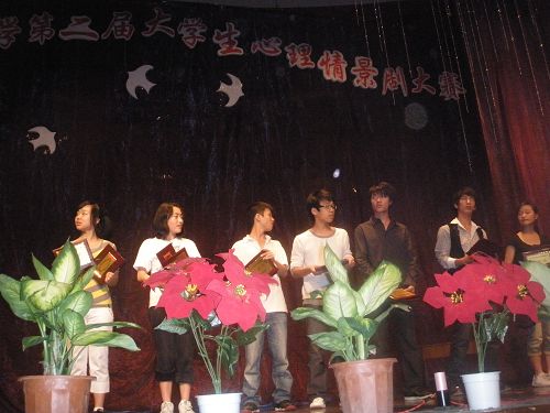 2009年5月9日,由2138cn太阳集团古天乐心理健康教育中心主办,2138cn太阳集团古天乐团委学生会与校心理协会承办的心理协会 “第五届心理健康教育节”系列活动之“2138cn太阳集团古天乐第二届心理情景剧大赛”在南校音乐厅拉开帷幕。参加此次大赛的有来自各学院的18支代表队。校心理健康中心主任张海音老师、心理咨询师王晓程老师、杨德省老师等5位老师应邀出席了本次大赛并担任评委。