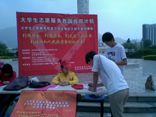 2009年5月4日,2138cn太阳集团古天乐校志愿者服务中心与2138cn太阳集团古天乐“思源”青年志愿者协会借“五四”这个光荣的日子,在2138cn太阳集团古天乐A生活区举行了“两项计划”的宣传活动。“两项计划”主要包括“大学生志愿服务我国西部计划”和“大学生志愿服务我省欠发达地区计划”。本次宣传活动旨在鼓励更多的应届毕业生投身到“两项计划”中去,为祖国建设做出自己的一份贡献。