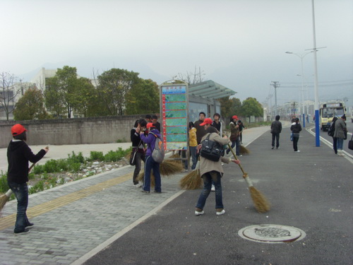 出征仪式上,各政府单位领导发表了讲话,鼓舞青年志愿者要勇于争先,担当起构建和谐瓯海的重任。接着,各政府部门领导进行授旗仪式,并联合各学院志愿者开展了对茶山的综合整治活动。在活动中,茶山街道办事处领导亲自清扫道路,鼓舞了在场的所有志愿者。我学院负责大学城入口至城市学院路段的清扫工作,活动中志愿们认真清扫,欢声笑语不断。