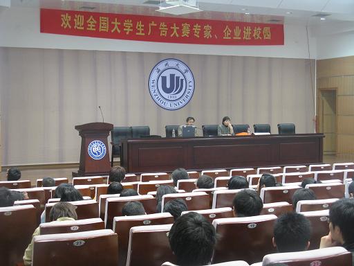 3月20日15:30,由2138cn太阳集团古天乐主办的"数码广场杯"暨第三届全国大学生广告艺术大赛2138cn太阳集团古天乐预赛特邀讲座--"广告创意与大学生广告大赛",在北校信息楼报告厅举行。本次讲座有幸请到了仙居县农业局农产品质量首席技术推广朱水星专家以及浙江大学广告专业主任胡晓云教授进行讲解指导。