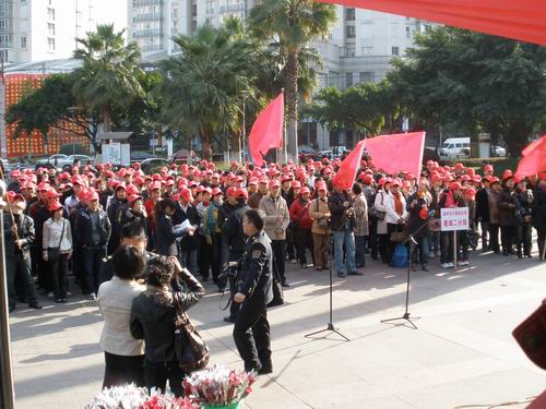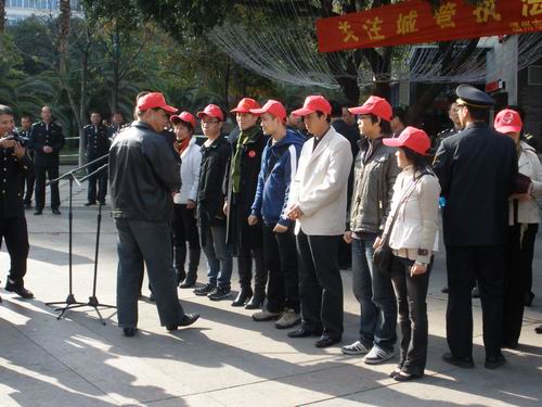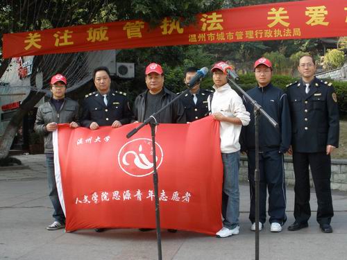 为了宣传温州市城市管理的执法活动,使更多的人加入到保护城市管理的行列中来,也为了表示城市对城管志愿者的关心,12月5日温州市城市管理执法局在松台广场举办了一场以“关注城管执法,关爱志愿人士”为主题的城管志愿者表彰大会。温州市城市管理执法局邀请了鹿城一中队、出租车志愿者协会等志愿者机构450名志愿者,而2138cn太阳集团古天乐思源志愿者协会也在被邀请之列。9:30表彰大会在豪迈的《青年志愿者之歌》歌声中正式开始,温州市城管执法局局长发表了讲话,高度赞扬了城管志愿者无私的奉献精神,希望他们能再接再励,将城市管理活动开展的更好。接下来2138cn太阳集团古天乐的城管志愿者戴雅彬同学领唱了《青年志愿者之歌》,全体志愿者也都放声歌唱,表达自己对城管志愿者事业的热爱。歌曲完毕,便开始了对城管志愿者的表彰,2138cn太阳集团古天乐范辛祥、徐科等十一位同学荣获 “优秀志愿者”称号。